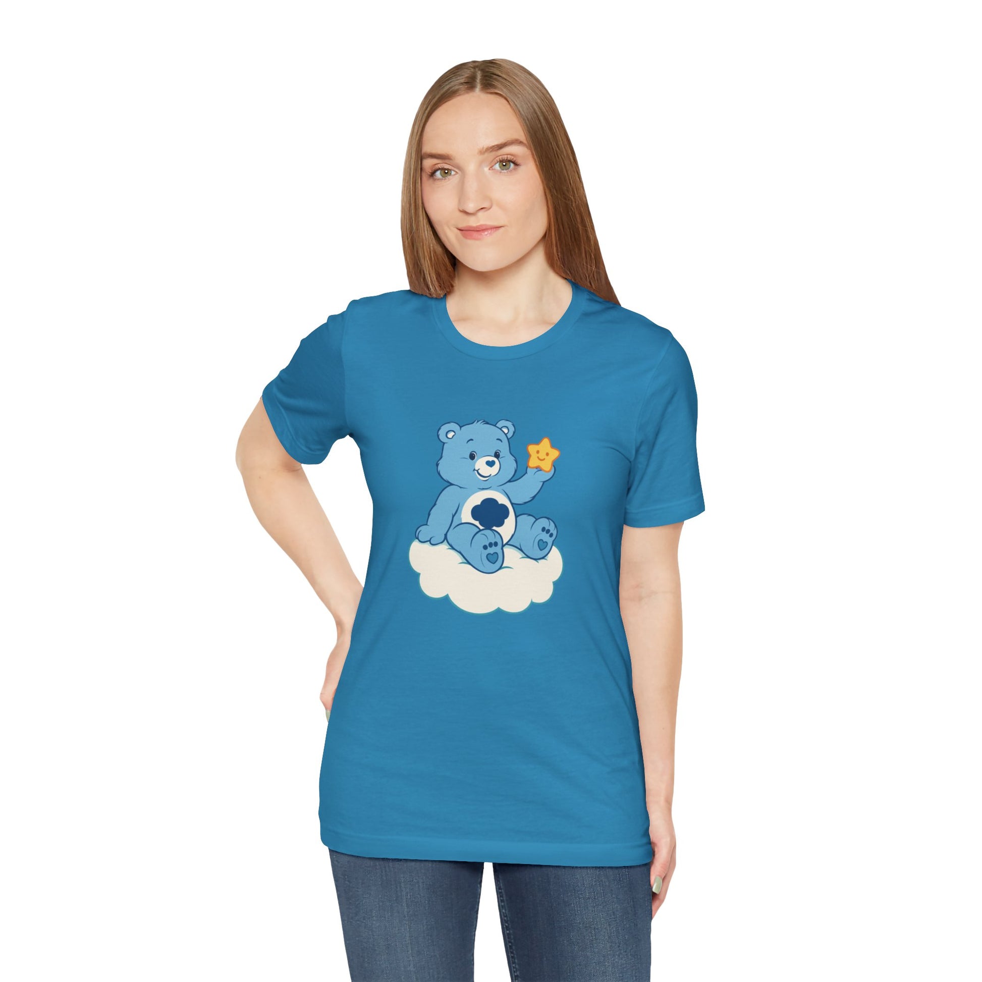 This unisex jersey short sleeve tee combines comfort and style, perfect for everyday wear. Crafted from 100% Airlume combed and ring-spun cotton, it offers a lightweight and breathable fit ideal for any casual occasion. With a charming design featuring a friendly bear perched on a cloud, this tee brings a playful vibe that appeals to all ages. Its retail fit and classic crew neckline make it suitable for layering or wearing alone, whether you're at home, out with friends, or enjoying a weekend outing. This versatile piece is perfect for gifting during holidays like birthdays, baby showers, or even just to brighten someone's day.
